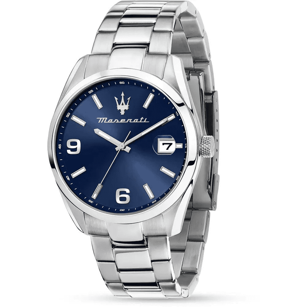 Мъжки часовник Maserati Attrazione R8853151013 – корпус от неръждаема стомана 43 мм, циферблат със слънчево синьо, кварцов механизъм с функции за час и дата. Гривна от стомана с катарама тип diver, сапфирен кристал, устойчив на надраскване, и водоустойчивост 5 ATM. Доставя се в оригинална кутия с 2 години гаранция.
